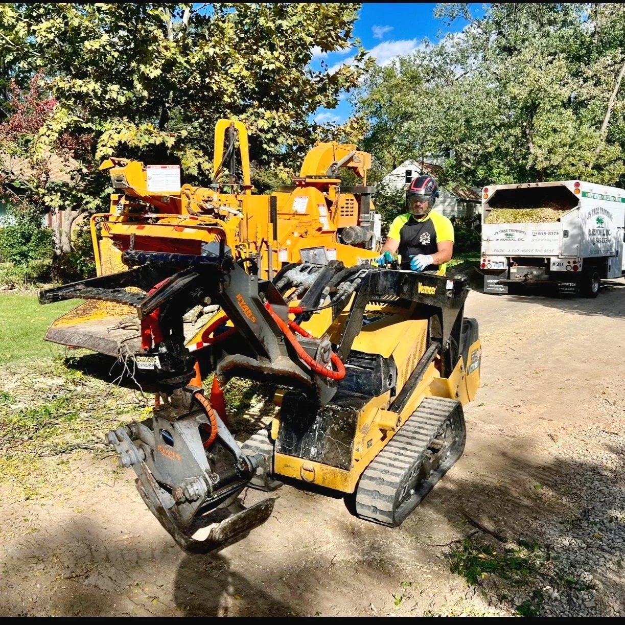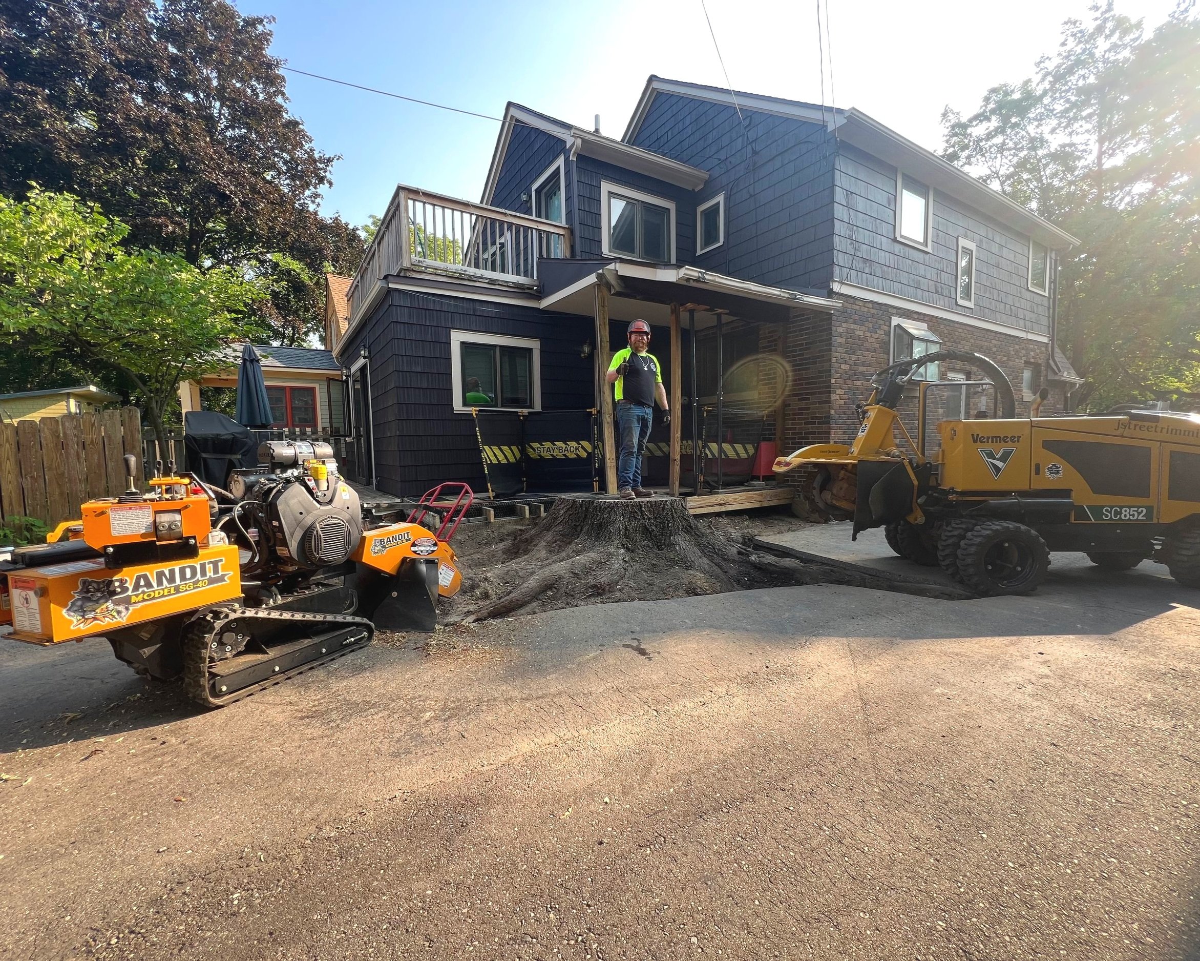 Most times a homeowner will want to have a stump removed to address the aesthetic of where a tree has been removed. The grinder uses a rotating cutting disc to chip away the wood. This process, of using a high-speed disk with teeth that grind the stump and roots into small chips, leaves a depression which can be covered over with top soil and seed to allow newly planted grass to flourish and grow green. Additionally, our machine has a blade which allows us to push the mulch back in the work area to help ensure a fully ground stump.